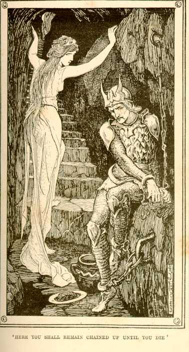 The Witch maiden puts the ring on her left thumb, picks the young man up with one hand and stashes him in a deep cave -- where she chains his hands and feet. She promises him that he'll stay there until the day he dies: